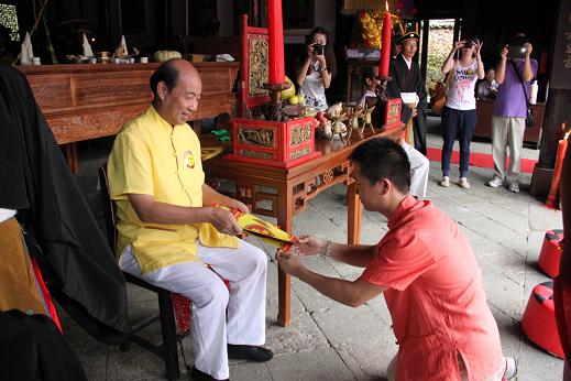此次拜师仪式隆重,刘氏二十四代传人在刘基庙分别叩拜了刘基像,师爷刘广斌,师傅魏庆岷,并现场交换了拜师贴。刘广斌介绍,自己是刘伯温二十二代孙,每年的清明节和六月十五都来祭拜刘伯温。今天是他的弟子在这里举行拜师会,不仅是为了朝拜太公,同时,也希望祖先所在的地方,能随着社会的发展而发展。希望这样的活动能够促进南田镇的经济发展,对文成的招商引资起到一定的作用。因为,这些徒弟当中,很多都是优秀的企业家,希望他们能为南田的经济提供帮助与服务。