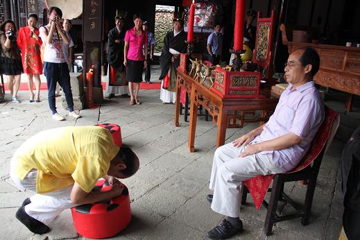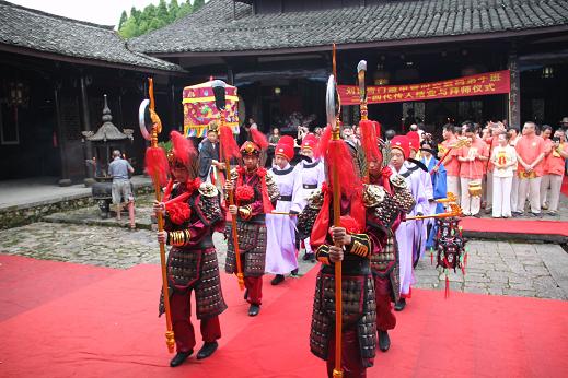 7月21日上午,第五届中国(文成)刘伯温文化节即将开幕之际,刘伯温第二十二代孙刘广斌在南田镇刘基庙举行刘氏奇门遁甲暨时空数码弟子班二十四代传人结业与拜师仪式。