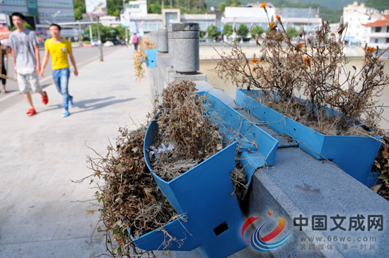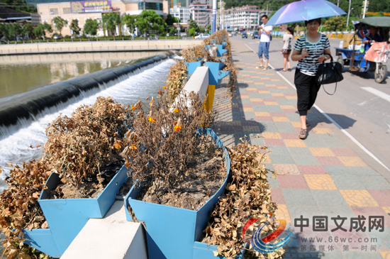 近日,有热心市民向我网民情热线反映,受持续高温天气影响,安置在我县各座大桥栏杆上的小盆栽全部“中暑”并枯死,严重影响市容,希望得到相关部门的重视及管理。