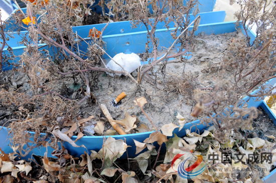 就此事,记者来到城东大桥,远远望去,只见大桥两侧共一百多盆盆栽一片枯黄,枯萎的叶子耷拉在栏杆上显得“死气沉沉”。走近一看,记者发现这些被晒干的植物叶子,手轻轻一碰就掉了下来,并且可以轻易捏成粉末。同时,记者还注意到,由于疏于管理,一些花瓣或者叶子上已经出现了蜘蛛网,盆栽内部更是散布着废弃的纸巾、塑料袋、烟蒂等垃圾。