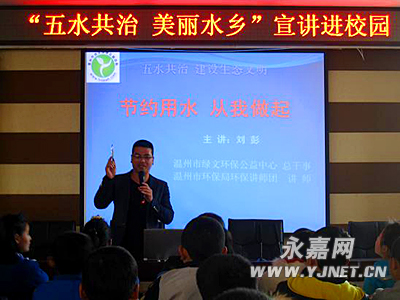 温州市绿文环保公益中心党员志愿者刘彭在该校进行了宣讲活动,从世界水日、中国水周等知识开始介绍,结合“五水共治,建设美丽浙南水乡”、“水环境小知识”等方面向小朋友们进行了讲解。随后还开展了生态环保知识趣味竞猜,寓教于乐,在游戏中,传递环保小知识,以轻松的方式将环保意识带入校园,提高小朋友们的环保意识。