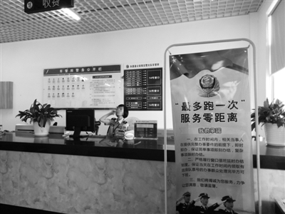 永嘉车管所综合业务大厅,易拉宝上承诺“最多跑一次”。项锐摄