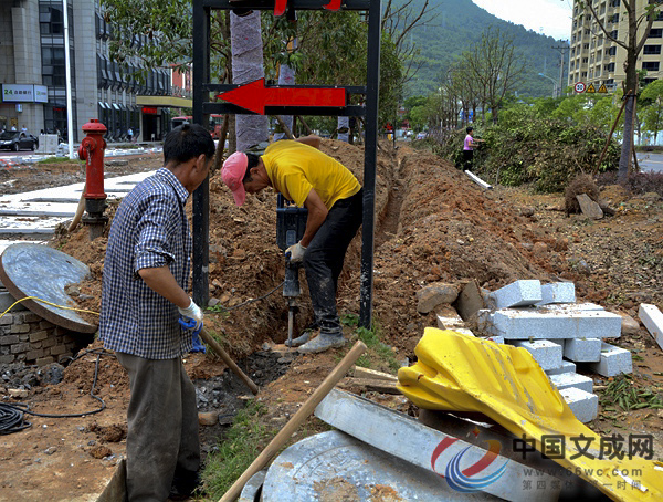 近日,记者来到了县旅游集散中心。在施工现场,记者发现该工程的室外部分已经基本成型,目前施工人员正在忙着种苗木、挖土将电线入地。而在工程的室内部分,施工人员正在忙碌着安装钢化大理石。另外,在室内部分的门口位置,还立着一个大大的倒计时记录牌,上面写着“距本工程竣工第16天”,提醒全体施工人员要撸起袖子加油干,争取按时完成工程。